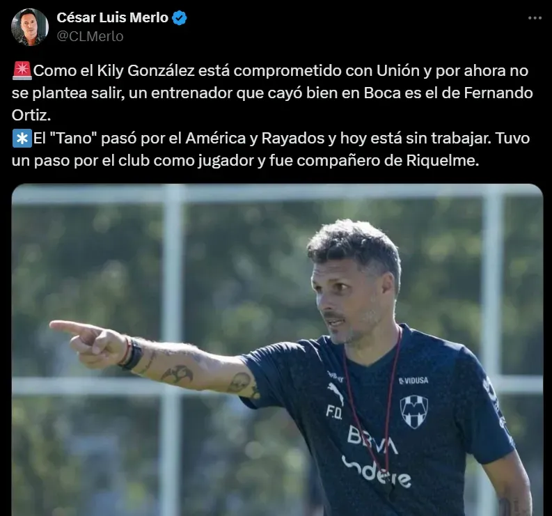 En palabras del cronista, el nombre de Fernando Ortíz “cayó bien” en la interna xeneize y podrían gestionarse avances en las próximas horas. Boca quiere cerrar un entrenador cuanto antes, ya que pretenden que el interinato de Mariano Herrón sea escueto, como en las dos ocasiones anteriores. Y con el ex DT de Rayados pueden lograr dicha rapidez debido a que se encuentra libre desde su desvinculación en México.
