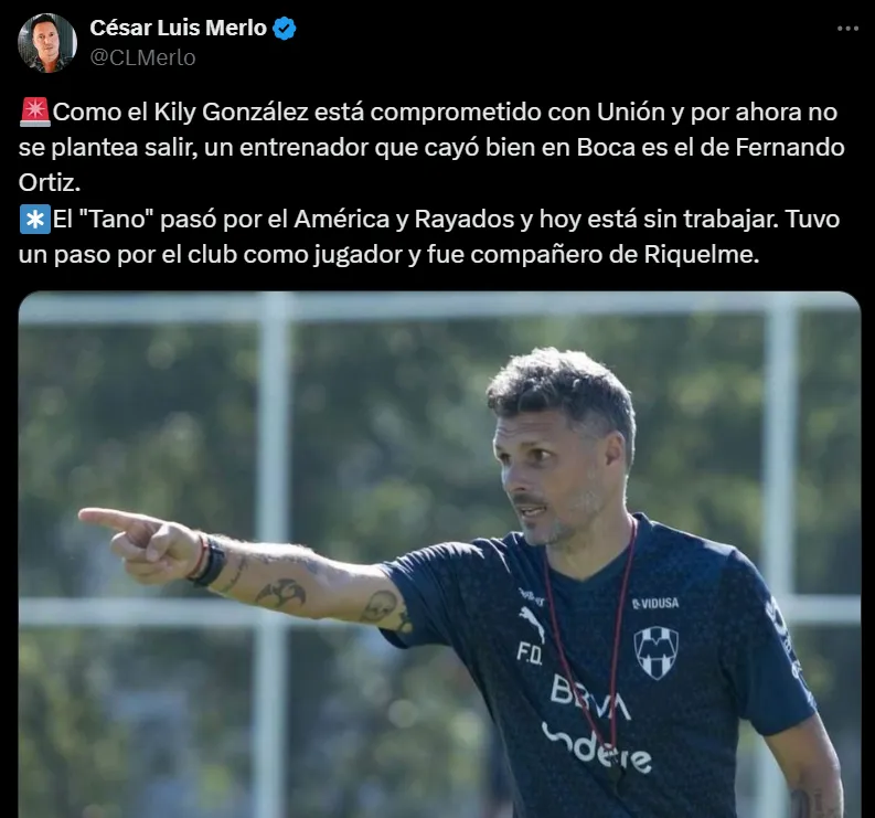 El periodista César Luis Merlo reveló que la opción principal de Boca y de Riquelme es Cristian “Kily” González, pero no es posible gestionarse su salida en este momento de Unión de Santa Fe. Entre los entrenadores que se encuentran libres, Ortíz parece ser una alternativa que tienta al presidente del club de la Ribera.