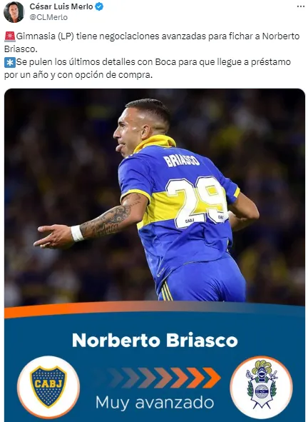 Según la información de César Luis Merlo, Boca y Norberto Briasco están en negociaciones avanzadas para que el delantero juegue a préstamo en Gimnasia La Plata. Sería una cesión por un año con opción de compra para el Lobo.