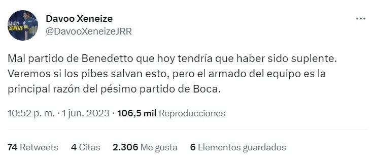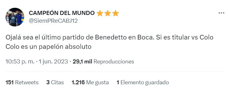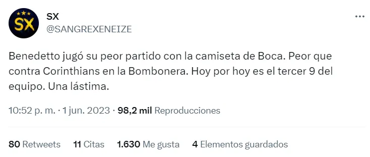 Fueron muchos los puntos bajos del equipo de la Ribera, pero los simpatizantes hicieron foco en uno en particular: Darío Benedetto. El Pipa compartió ataque con Miguel Merentiel y volvió a estar lejísimos de su mejor versión. El entrenador lo sacó a los 20′ del segundo tiempo.