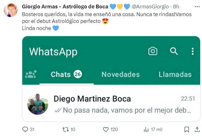 Al conocer la noticia, el astrólogo expresó su malestar en su cuenta de Twitter. Sin embargo, al cabo de unos minutos, decidió cambiar el chip y mandarle un mensaje optimista al estratega. A través de WhatsApp, le escribió: “No pasa nada, vamos por el mejor debut astrológico”.