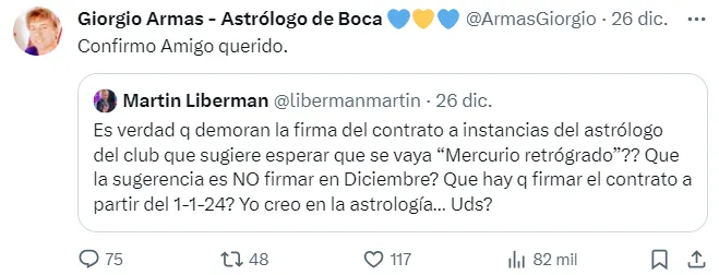 “¿Es verdad que demoran la firma del contrato a instancias del astrólogo del club que sugiere esperar que se vaya mercurio retrógrado?”, había preguntado Martín Liberman hace unos días. “Confirmo, amigo querido”, afirmó Armas. Finalmente, desde el Xeneize eligieron resolver todo ahora.