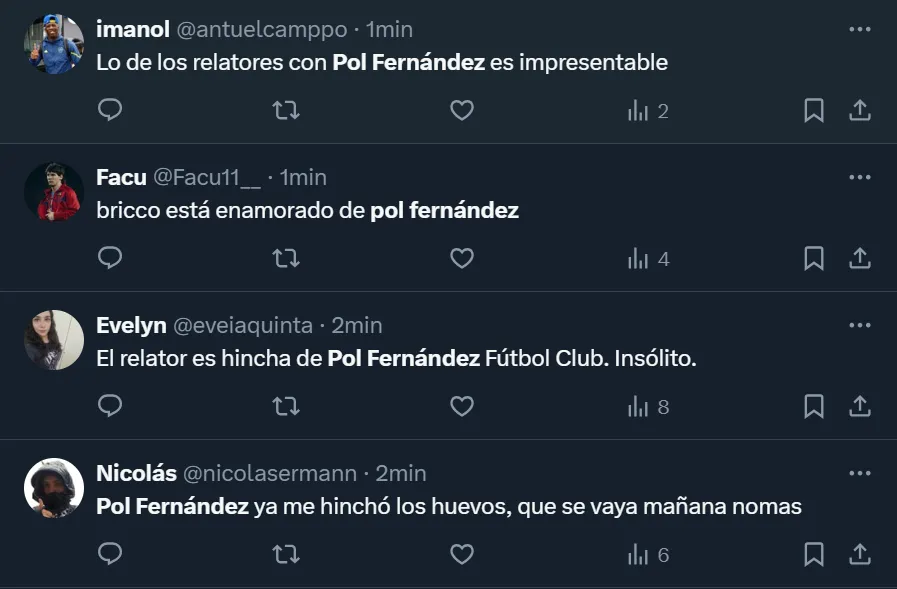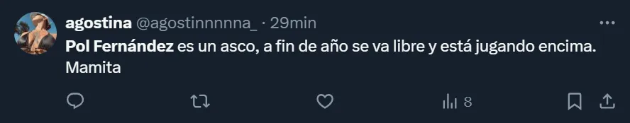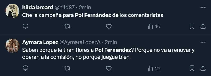 Más allá de que en ciertas estadísticas tuvo un buen porcentaje, como fueron los pases precisos, donde acertó 83 de 93 (89%), perdió la posesión del balón en 11 oportunidades, cometió dos infracciones y no logró regatear a ningún rival. Y sumado a que fue el capitán del equipo tras confirmarse su salida hacia Fortaleza, a donde recalará en enero tras firmar un precontrato para irse con el pase en su poder, los fanáticos cuestionaron a Pol Fernández.