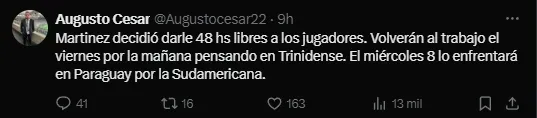 Pensando en dicho partido ante Sportivo Trinidense en Paraguay, que se dará recién en una semana (próximo miércoles 8), el entrenador de Boca tomó una tajante decisión con el plantel: darle dos días de descanso y que recién se reincorporen a los entrenamientos el próximo viernes 3 de mayo.