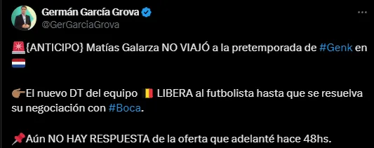 En este sentido, el Genk aún no respondió la oferta que envió Boca de 3 millones de dólares por el 50% del pase pero sí tomaron una fuerte decisión con el futbolista. Según informó el periodista Germán García Grova para Bolavip, el nuevo entrenador del club belga, Thorsten Fink, liberó a Matías Galarza de la pretemporada del equipo mientras se resuelve su situación con Boca.
