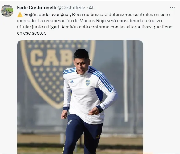 Acorde a lo que informa el periodista Federico Cristofanelli, Boca no buscará defensores centrales en este mercado, ya que la recuperación de Marcos Rojo será considerada refuerzo para ser titular junto a Figal, y Almirón está conforme con las alternativas que tiene en ese sector.