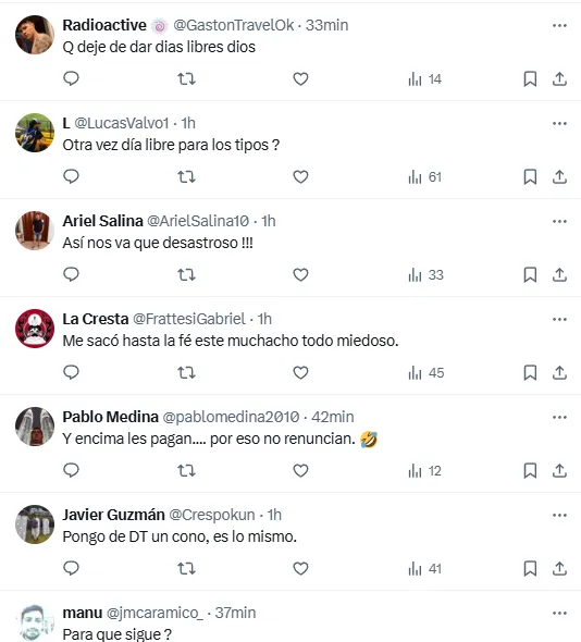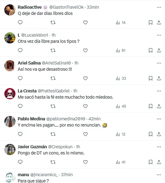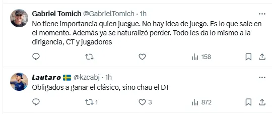 “Es una joda este club”, “es un chiste”, “ciclo cumplido”, “qué vergüenza”, algunos de los comentarios que aparecieron en la plataforma de X (ex Twitter) tras conocerse la decisión del DT tras la caída contra la Academia, marcándole la cancha al entrenador previo a un partido que podría ser determinante, tanto dentro como fuera de la cancha.