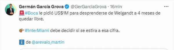 Según lo informado por el periodista Germán García Grova, desde el Xeneize le pidieron un millón de dólares al Inter Miami para liberar ahora a Weigandt, por lo que ahora la pelota la tiene el elenco estadounidense, que deberá decidir si paga ese dinero o si avanza por otra variante.