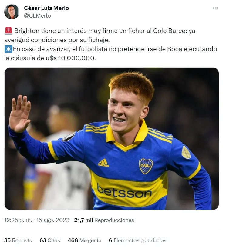 Según informó el periodista César Luis Merlo, Barco “no pretende irse de Boca ejecutando la cláusula”. El Colo no desea abandonar el club a días de una serie tan importante, pero todo está por verse. Se vienen reuniones entre las partes para tomar una decisión clave.