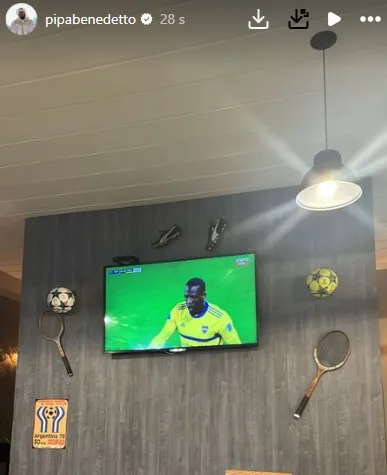 Benedetto le tomó una foto al televisor y mostró que está siguiendo a sus compañeros a la distancia. Desde su domicilio, el Pipa hace fuerza para que el club de sus amores saque un buen resultado contra un durísimo rival, al que supo enfrentar cuando llegó en 2016.
