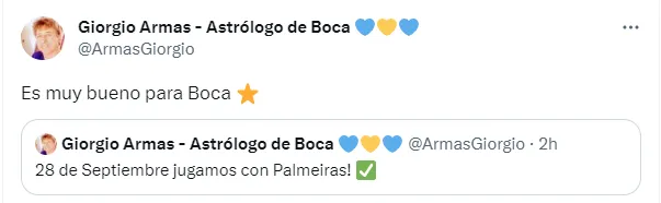 Referido a estas fechas, Giorgio Armas, el reconocido astrólogo de Boca, quien predijo que pasarían contra Racing por penales, dejó una fuerte afirmación en su cuenta de Twitter que ilusionó a los hinchas: “El 28 de septiembre jugamos contra Palmeiras. Es muy bueno para Boca”, tiró.