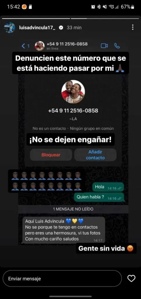“Denuncien este número. Alguien se está haciendo pasar por mi. ¡No se dejen engañar! Gente sin vida“, disparó el lateral peruano, publicando el teléfono de la persona que estaba robándole la identidad en Whatsapp.