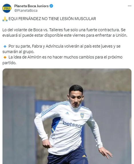 La buena noticia para el Xeneize es que su mediocampista titular no padece de una lesión de gravedad. Sin embargo, tanto Jorge Almirón como el propio jugador son conscientes de la importancia que tendrá la administración de cargas dentro del plantel previo a jugar la final de la Copa Libertadores y no está confirmada la presencia de Equi Fernández para el duelo de este viernes ante Unión por la Copa de la Liga.
