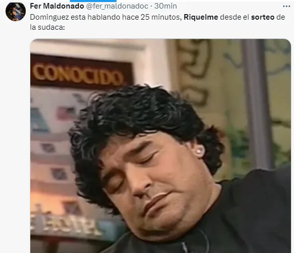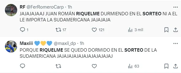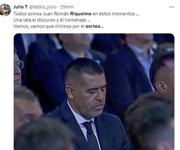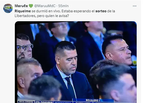 “Riquelme se durmió en vivo. Estaba esperando el sorteo de la Libertadores, pero alguien que le avise”, “Riquelme está roncando en el sorteo de la Sudamericana”, “Riquelme se durmió en vivo”, fueron algunos de los comentarios de los usuarios referido a esta imágen del presidente de Boca.