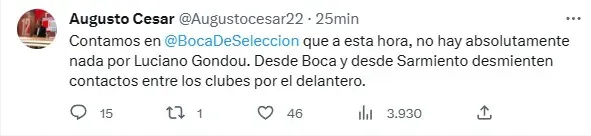 “Contamos en Boca De Seleccion que a esta hora, no hay absolutamente nada por Luciano Gondou. Desde Boca y desde Sarmiento desmienten contactos entre los clubes por el delantero“, expresó el reconocido periodista de ESPN que cubre al Xeneize a diario. En el cruce de versiones, Gondou será uno de los grandes protagonistas de la noche en La Bombonera y los hinchas le pondrán atención con la posibilidad latente de que se convierta en refuerzo.