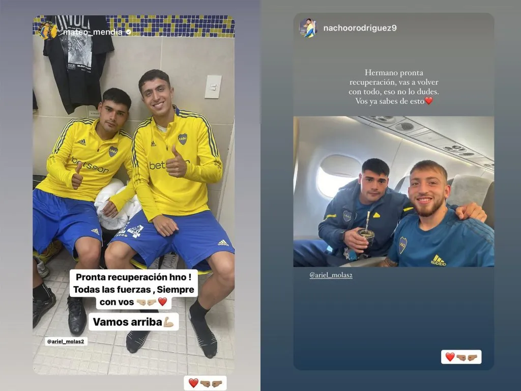 Mateo Mendia e Ignacio Rodríguez fueron los primeros juveniles de Boca en expresarse a través de las redes sociales tras la lesión de su compañero, y realizaron posteos muy emotivos para brindarle mucho aliento.