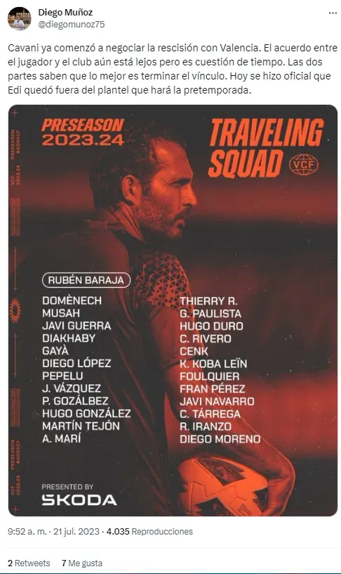 “Cavani ya comenzó a negociar la rescisión con Valencia. El acuerdo entre el jugador y el club aún está lejos pero es cuestión de tiempo. Las dos partes saben que lo mejor es terminar el vínculo”, aseguró el periodista uruguayo Diego Muñoz de ESPN. Boca está a la espera de que se destrabe esa situación para ir por todo.