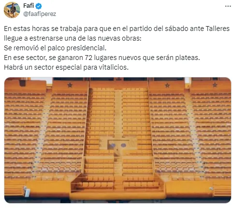 Riquelme mandó a desmontar el palco presidencial que estaba ubicado en el centro de la platea media, creado en gestiones anteriores. Se espera que esté listo para el duelo ante los cordobeses.