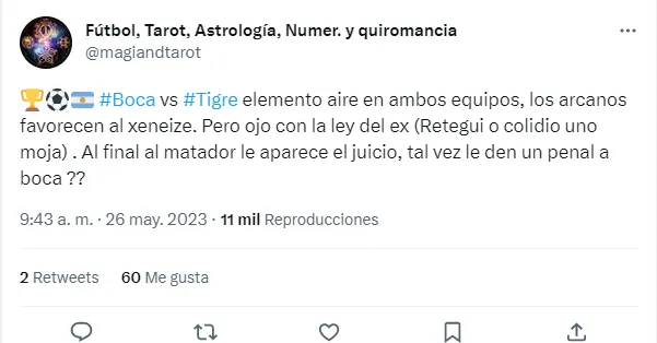 “Boca vs Tigre elemento aire en ambos equipos, los arcanos favorecen al Xeneize. Pero ojo con la ley del ex (Retegui o colidio uno moja). Al final al Matador le aparece el juicio, tal vez le den un penal a Boca??”, posteó, indicando que los delanteros del Matador de Victoria tienen altas probabilidades de anotarse en el marcador.