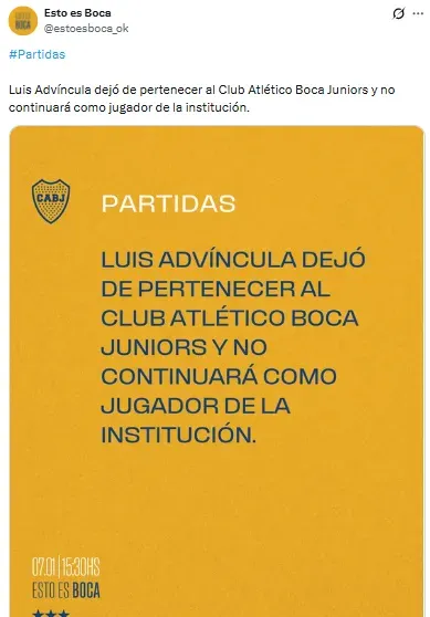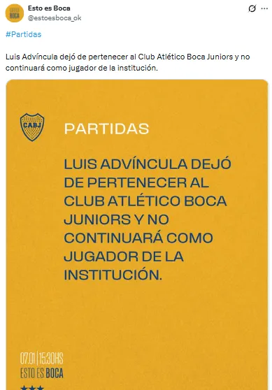 Para abrir el año, la cuenta de X @estoesboca_ok, la que utiliza Boca para dar a conocer renovaciones de contratos, incorporaciones y salidas, confirmó la salida de Luis Advíncula, anticipada por BOLAVIP este martes por la noche.