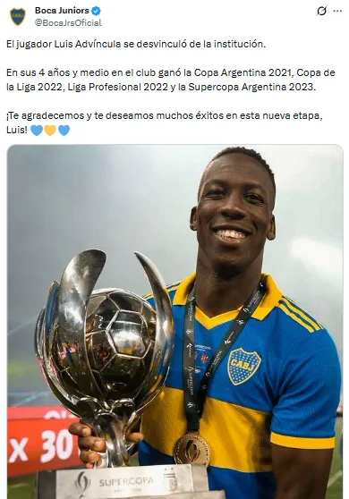 En la cuenta oficial del club, hubo lugar para agradecimientos para el peruano: “El jugador Luis Advíncula se desvinculó de la institución. En sus 4 años y medio en el club ganó la Copa Argentina 2021, Copa de la Liga 2022, Liga Profesional 2022 y la Supercopa Argentina 2023.¡Te agradecemos y te deseamos muchos éxitos en esta nueva etapa, Luis!”.