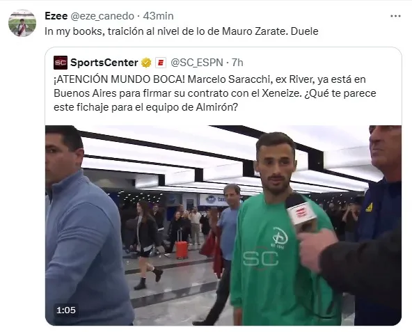 “Estoy contento de llegar”, fue la primera frase que soltó el lateral uruguayo. Inmediatamente, desde ESPN le preguntaron: “¿Costó tomar la decisión?”. Saracchi replicó de forma contundente: “No”. La liviandad de la respuesta del futbolista charrúa no cayó bien entre los hinchas del Millonario y rápidamente hubo reacciones en Twitter.