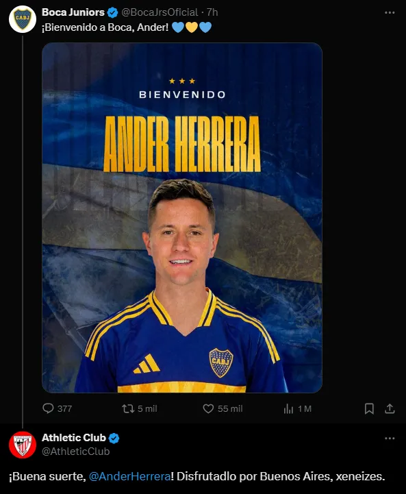 Más allá de haber realizado publicaciones en su perfil con las palabras que Herrera dejó en su despedida del club, el conjunto vasco le dedicó un adiós puntual en las redes de Boca. Como comentario al posteo del equipo azul y oro, el Bilbao expresó: “¡Buena suerte, Ander Herrera! Disfrutadlo por Buenos Aires, xeneizes“. Por las reacciones que los propios hinchas dejaron, parece que le harán caso al mensaje que Athletic dejó en la cuenta de Boca.