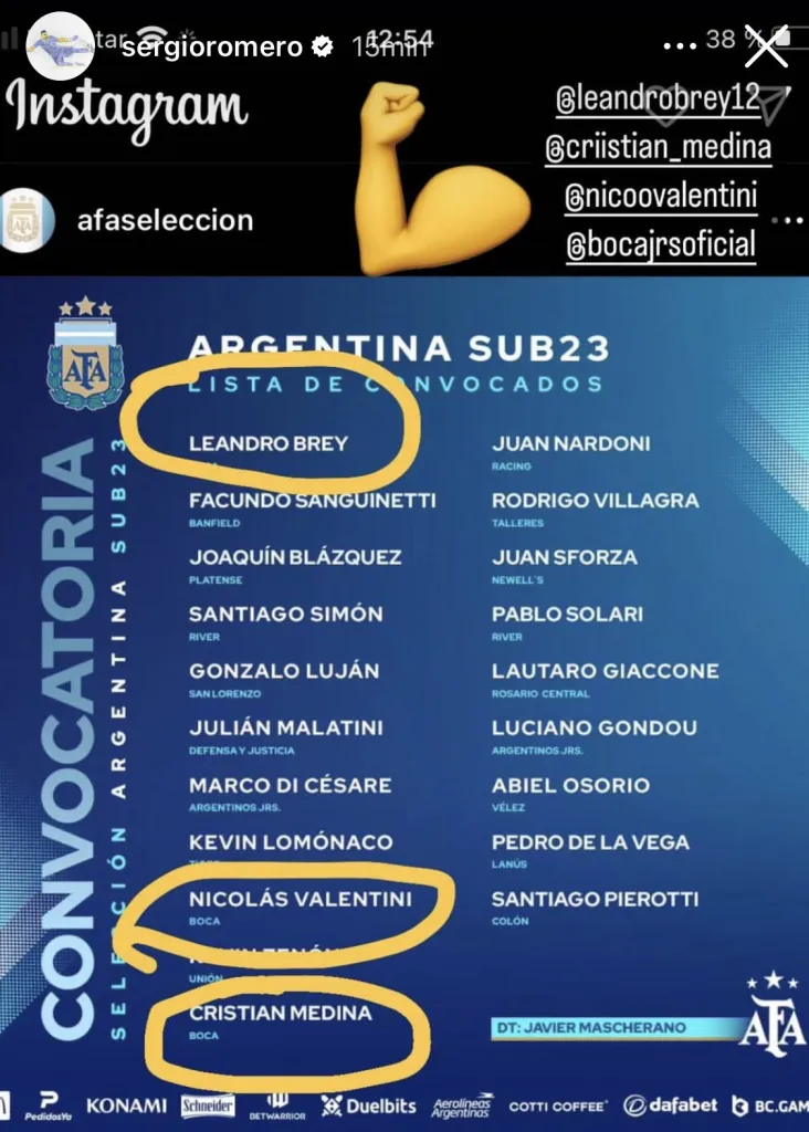 Romero celebró la aparición de Leandro Brey, Nicolás Valentini y Cristian Medina entre los elegidos por Javier Mascherano. Lo demostró en sus historias de Instagram, felicitándolos a los tres. Más allá de su importancia futbolística, el arquero demuestra su liderazgo dentro y fuera de la cancha.