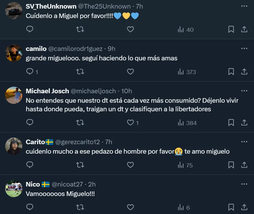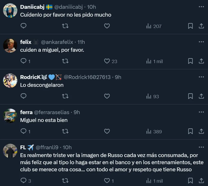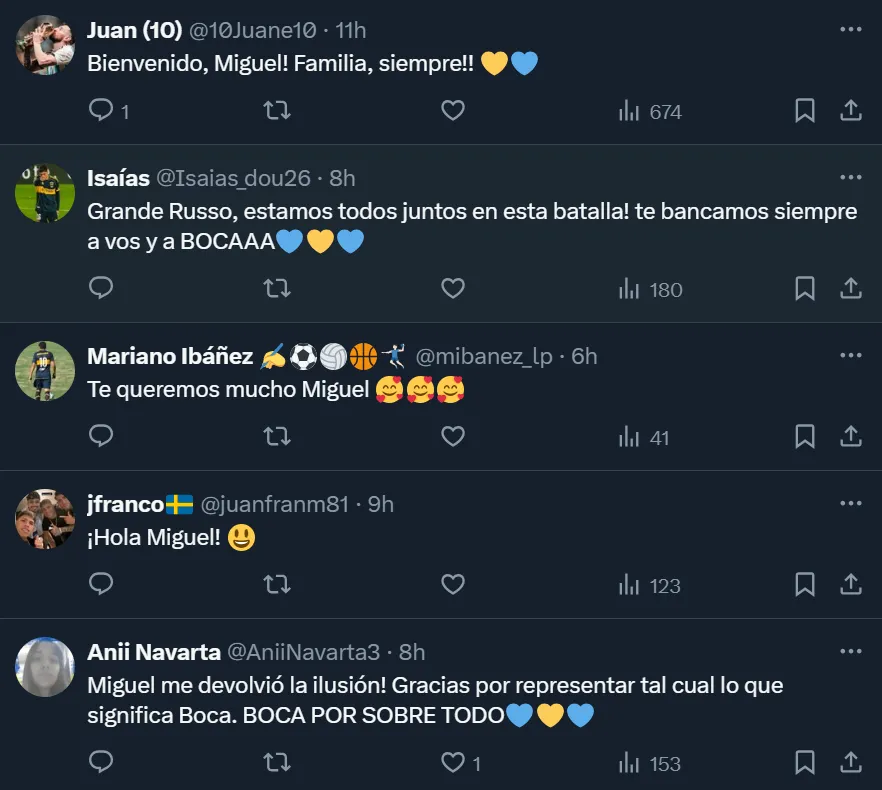 Para anunciar la vuelta de Miguel Ángel Russo, el club utilizó sus redes sociales. Allí se pudo observar al entrenador con el conjunto del Xeneize y una gran sonrisa en su cara. No quedan dudas que la felicidad del DT es estar trabajando, pese a que podría estar descansando junto a su familia ya que lo consiguió todo en el fútbol, pero su motor es estar en una cancha. La reacción de los hinchas en las redes fue de alegría por verlo de nuevo, aunque también muchos pedían que lo cuiden desde el club.