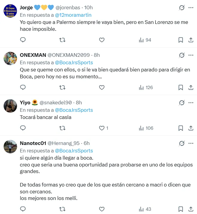 “Me dolería”, “no quiero”, “quiero que le vaya bien pero en San Lorenzo se me hace imposible“, escribieron algunos hinchas en la red social X. Otros, en tanto, se pronunciaron favorablemente: “Tocará bancar a Casla”, “es una buena oportunidad para probarse”, “en La Bombonera será ovacionado como siempre“.