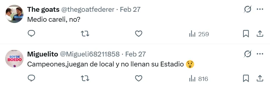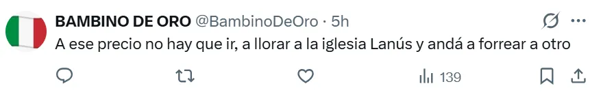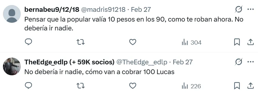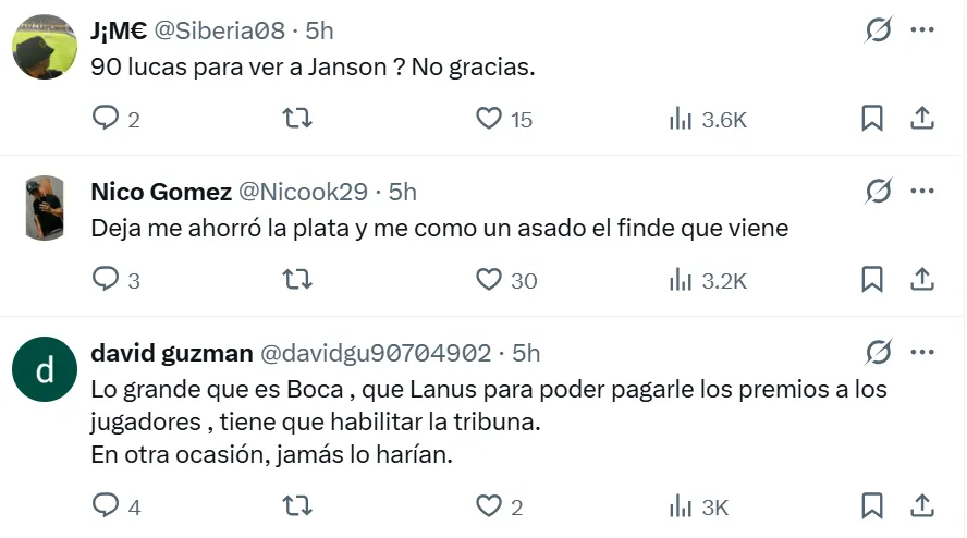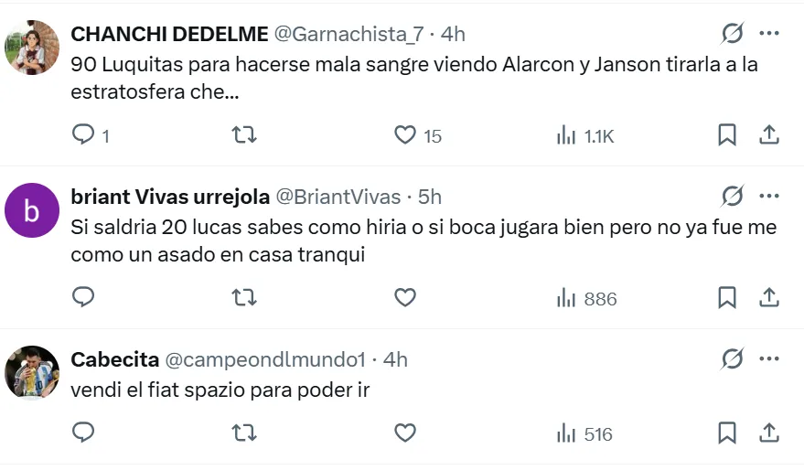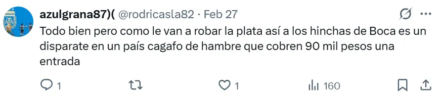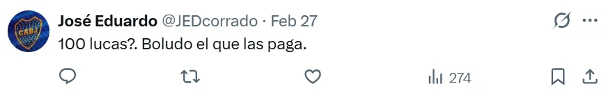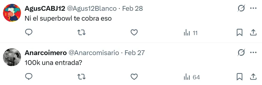 Como era de esperarse, las redes sociales se convirtieron en el principal canal de descargo para los hinchas xeneizes, arrojando reacciones de lo más diversas. La sorpresa por el costo de los tickets derivó rápidamente en enojo e ironía. Entre las múltiples quejas, un usuario graficó el asombro con una comparación contundente: “Ni el Super Bowl te cobra eso“.