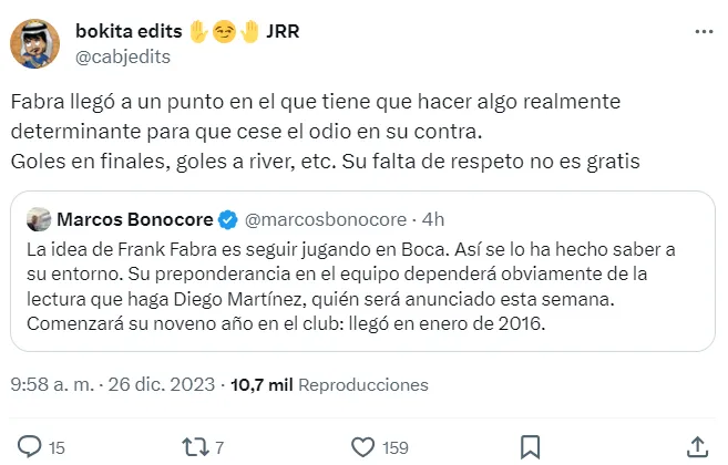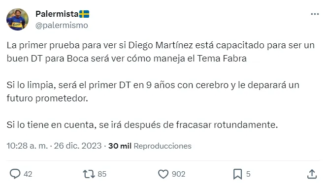 De forma casi unánime, la gente de Boca considera que Fabra debería irse en este mercado de pases y evitar iniciar lo que sería su noveno año en la institución. Esa es la postura que tomaron la mayoría de los hinchas, aunque la verdad absoluta se verá cuando le toque volver a jugar en La Bombonera.