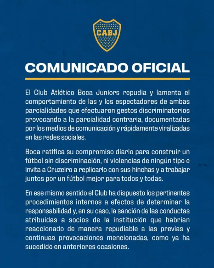 “Boca ratifica su compromiso para construir un fútbol sin discriminación, ni violencia de ningún tipo e invita a Cruzeiro a replicarlo con sus hinchas y trabajar juntos para un fútbol mejor para todos y todas. En ese mismo sentido, el club ha dispuesto los pertinentes procedimientos internos a efectos de determinar la responsabilidad y, en su caso, la sanción de las conductas atribuidas a socios de la institución que habrían reaccionado de manera repudiable a las previas y continuas provocaciones mencionadas, como ya ha sucedido en anteriores ocasiones”, se agregó.