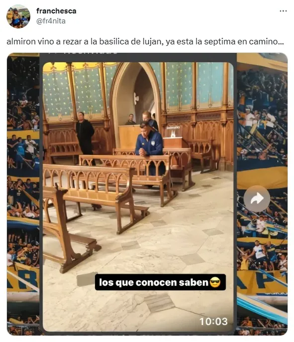 En redes sociales comenzó a circular una captura de pantalla de Whatsapp, donde un hincha advierte la presencia de Jorge Almirón en la Basílica de Luján el día sábado, a pocas horas de jugar contra Racing. En la imagen se lo ve al DT rezando de rodillas, un gesto que enloqueció a los fanáticos del Xeneize en Twitter. ¿Qué habrá pedido para los partidos contra Colo-Colo y River?