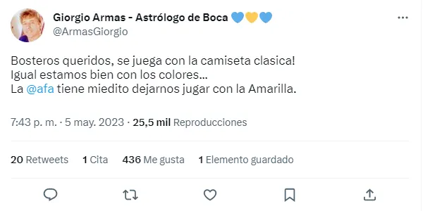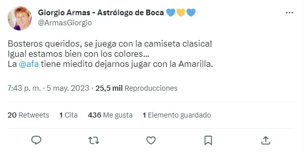 “Bosteros queridos, se juega con la camiseta clásica! Igual estamos bien con los colores. La AFA tiene miedito dejarnos jugar con la Amarilla”, posteó el astrólogo en su cuenta de Twitter.
