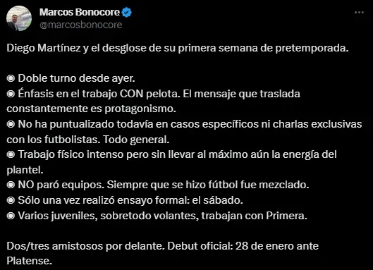Marcos Bonocore reveló, en este punto, que el DT de Boca mantiene charlas grupales en cada entrenamiento y que aún no enfatizó en casos puntuales. De momento, las indicaciones tácticas son a nivel general y busca el mismo objetivo en todo el plantel: que se adapten a su idea táctica.