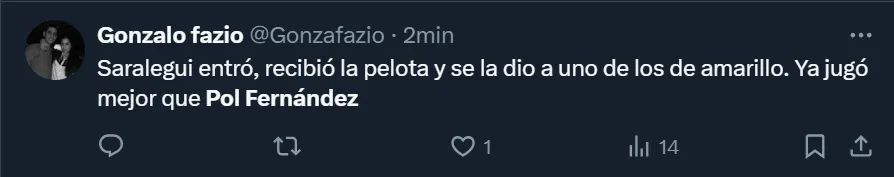 A pesar de que acertó el 90% de los pases que brindó hacia sus compañeros, Pol Fernándezfue duramente cuestionado por los fanáticos que comentaron las diversas acciones del encuentro a través de X, la antigua app conocida como Twitter. En el tiempo que disputó en el Jorge Luis Hirschi, el mediocampista solamente perdió 4 veces la posesión del balón, por lo que desde lo estadístico su actuación fue regular.