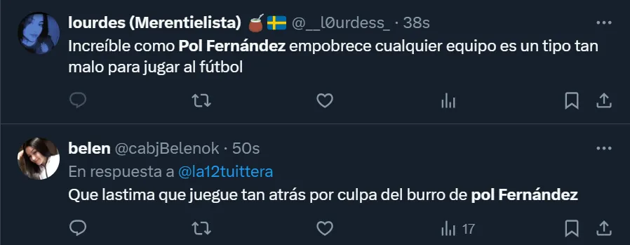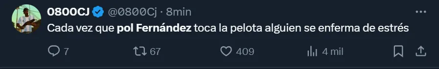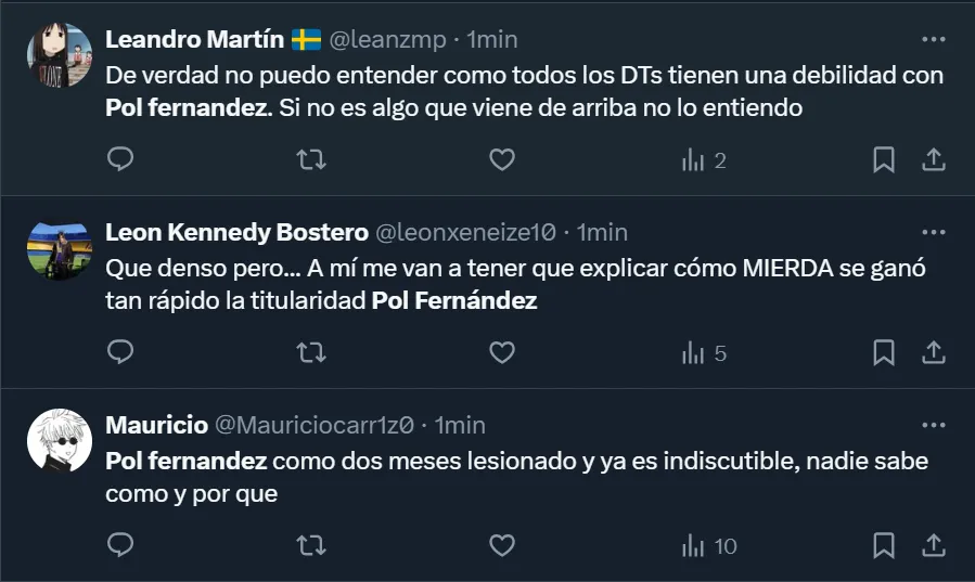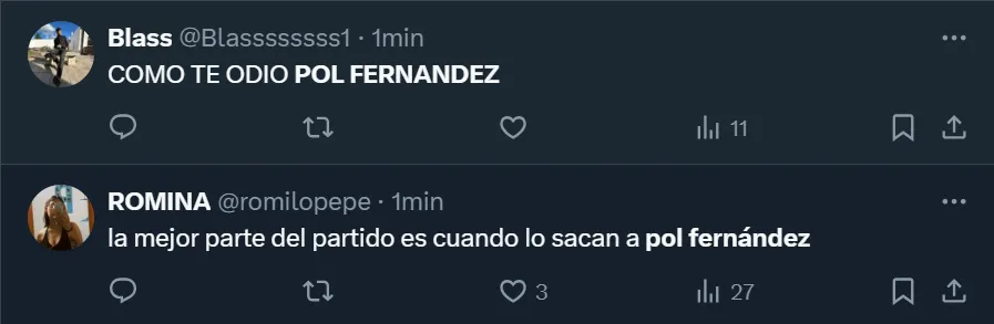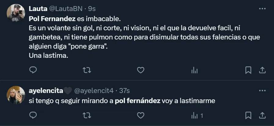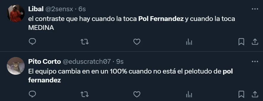 Si bien los números fueron algo favorables para Fernández, la hinchada virtual no lo toleró y lo cuestionó, tal como viene ocurriendo desde hace varios encuentros. Incluso, solicitan día tras día que se marche de la institución en el próximo mercado de pases, como así también que Martínez no lo utilice más.