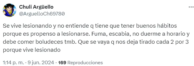 Pero decenas de hinchas del conjunto de La Ribera se sumaron a las críticas. “Basta. Afuera“, comentó simplemente uno de ellos, mientras que otro señaló: “Se vive lesionando y no entiende que tiene que tener buenos hábitos porque es propenso a lesionarse“.