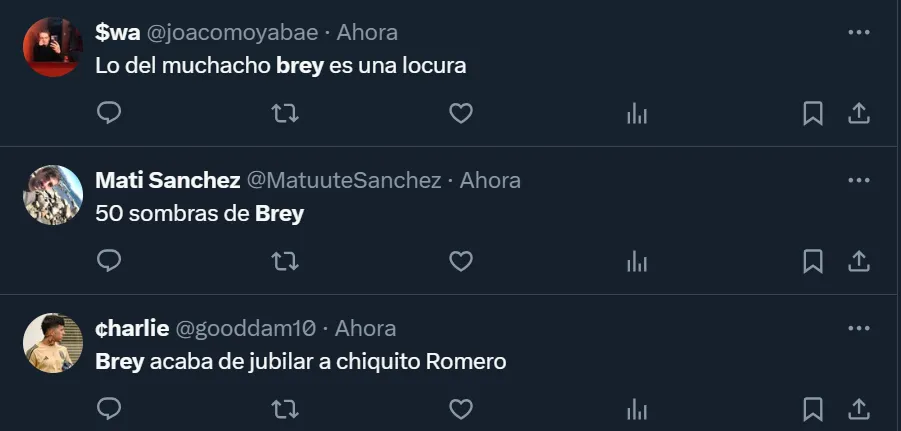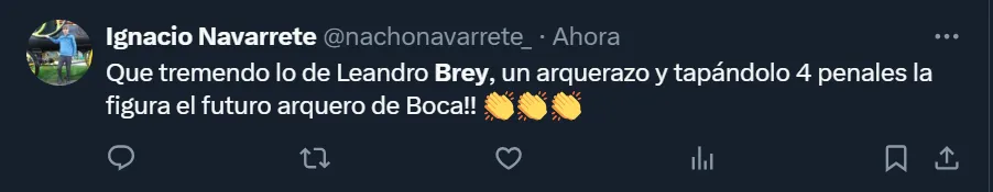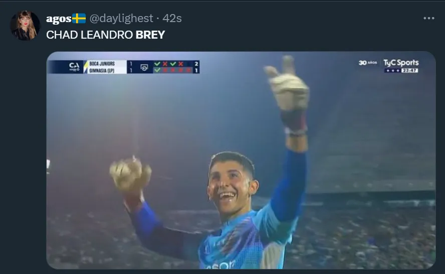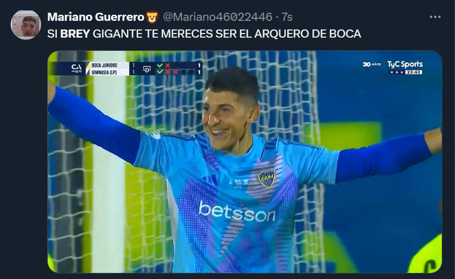 Si bien hubo un grave error de cálculo en la salida que tuvo Brey y que derivó en la igualdad del Lobo, desde los doce pasos se agigantó y tuvo una actuación fenomenal. Sí, tal como ocurrió con Sergio Goycochea en el Mundial de Italia 1990 o con el Dibu Martínez en Qatar 2022. Por eso mismo, los comentarios de los fanáticos transformaron al ex Los Andes en tendencia a nivel nacional. Pero no solo lo halagaron.