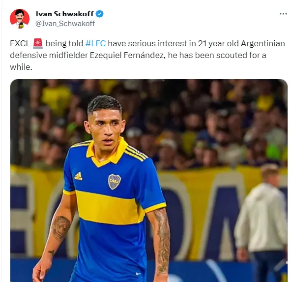 Acorde a lo que informa el periodista 𝗜𝘃𝗮𝗻 𝗦𝗰𝗵𝘄𝗮𝗸𝗼𝗳𝗳, Liverpool tiene un gran interés por Equi Fernández, a quien desde hace un tiempo considerable es seguido de cerca por el scouting del club, y tras la negativa de Moisés Caicedo, podría ofertar por él.