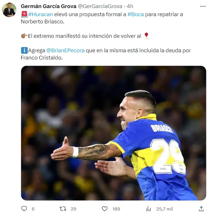 Según informó el periodista Germán García Grova, Huracán va con todo para repatriar a Norberto Briasco. El armenio ya no está en los planes de Jorge Almirón y busca salir para tener más continuidad. En el Xeneize quedó muy relegado, ubicándose por detrás de Janson, Zeballos y Langoni (hoy lesionado).