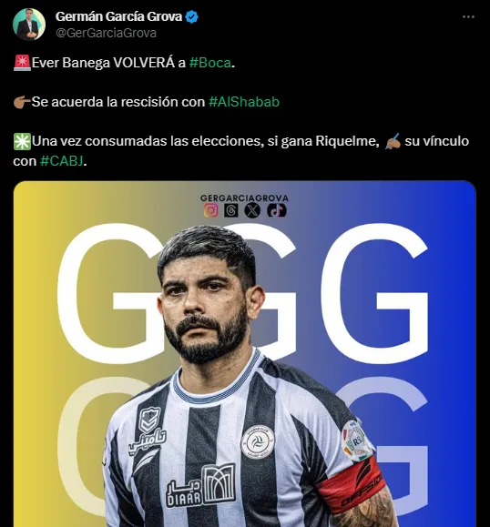 Es que a Éver Banega le deben dinero en el club árabe, por lo que, si esto no se resuelve, ante la propuesta que Boca le hizo para que regrese al equipo de la Ribera el rosarino romperá definitivamente su vínculo allí y llegará como agente libre al Xeneize. En paralelo, solo resta una condición del lado de Boca para que se efectúe 100% su fichaje en este mercado de pases: que Juan Román Riquelme se imponga en los comicios este domingo 17 de diciembre.