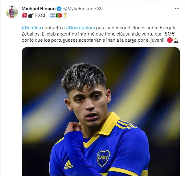 Acorde a lo que informa el periodista Michael Rincón, una salida que podría darse en este mercado es la de Exequiel Zeballos, debido a que Benfica se contactó con Boca para saber condiciones, y le informaron que tiene cláusula de recisión por 18 millones de euros, por lo que los portugueses aceptarían e irían a la carga por el juvenil.