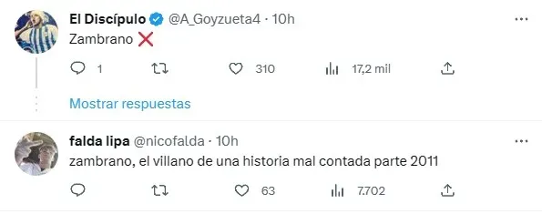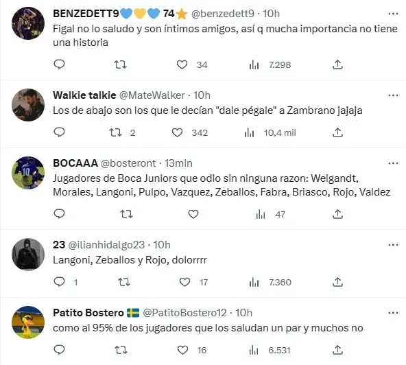Al pie del tuit de Hormiga Xeneize se armó el debate: también se incluyeron nombres como el de Carlos Izquierdoz y Carlos Zambrano, este último a raíz de sus últimas declaraciones sobre la pelea que mantuvo con el delantero antes de marcharse del fútbol argentino. En fin, especulaciones que hacen los propios hinchas.