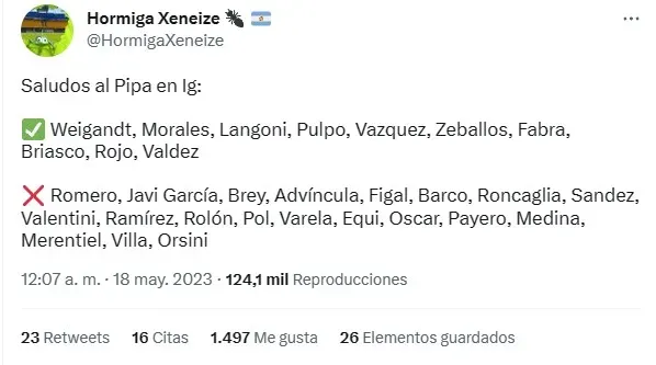 El reconocido usuario Hormiga Xeneize se tomó el tiempo de recolectar estos datos y los compartió mediante un tuit que generó revuelo. Hasta algunas horas de la tarde, solo Frank Fabra, Norberto Briasco, Marcos Rojo, Marcelo Weigandt, Gonzalo Morales, Luca Langoni, Pulpo González, Luis Vázquez, Exequiel Zeballos y Bruno Valdez habían felicitado al Pipa con un posteo en redes.