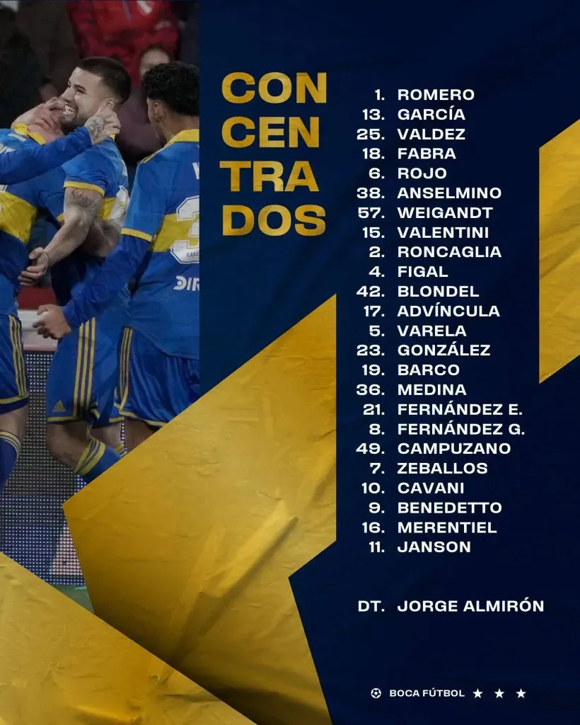 A falta de confirmación oficial, y con la posibilidad de algunos cambios durante el día del partido, Jorge Almirón ensayó un XI con estos nombres: Sergio Romero; Luis Advíncula, Nicolás Figal, Bruno Valdez, Nicolás Valentini, Frank Fabra; Cristian Medina, Pol Fernández, Valentín Barco; Edinson Cavani y Miguel Merentiel; en un esquema 5-3-2.