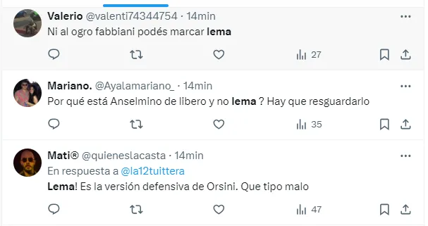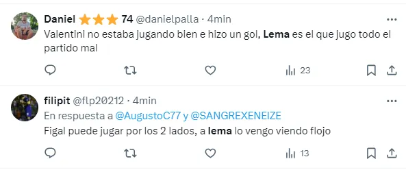 “Lema corre con paracaídas”, “No sé si se me colgó fútbol libre o Lema es así de lento”, “Es la versión defensiva de Orsini, que tipo malo”, “Lema jugó mal todo el partido”, fueron algunos de los tantos comentarios de los hinchas del Xeneize criticando el nivel del defensor central.