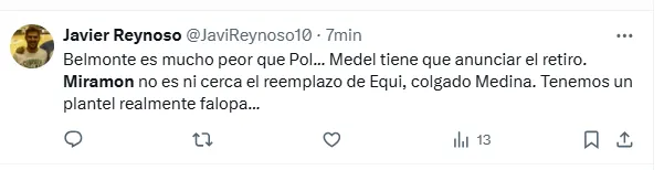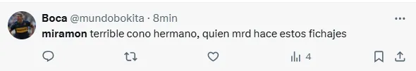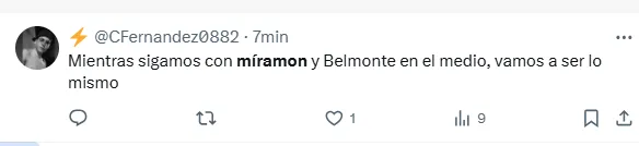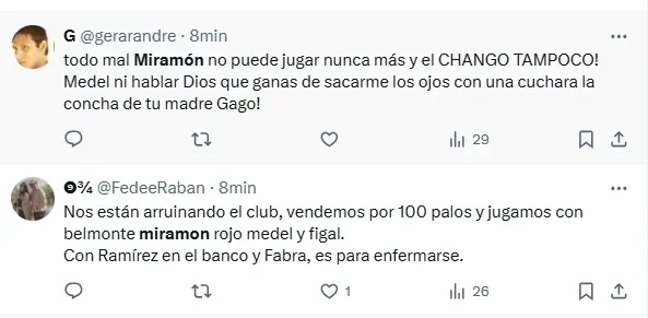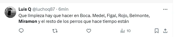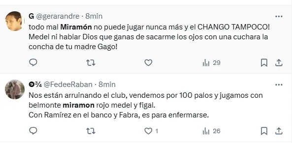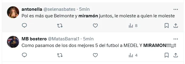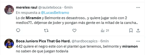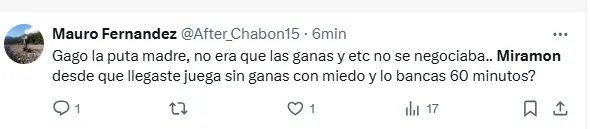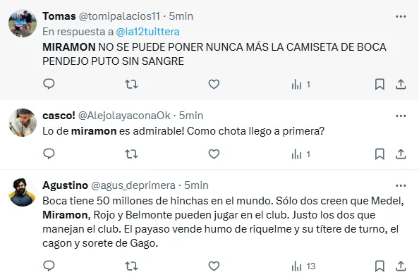 “Miramón no se puede poner más la camiseta de Boca”, “Miramón tiene que ser suplente”, “Lo de Miramón es desastroso”, “Miramón todavía no sabe de qué juega”, “Miramón no es ni cerca el reemplazo de Equi”, “Todo mal Miramón”, “Miramón es terrible cono”, fueron algunos de los comentarios de los hinchas criticando al volante central.