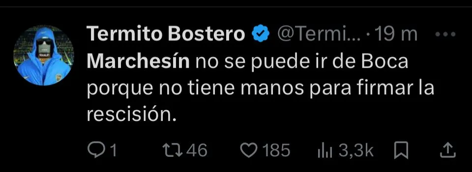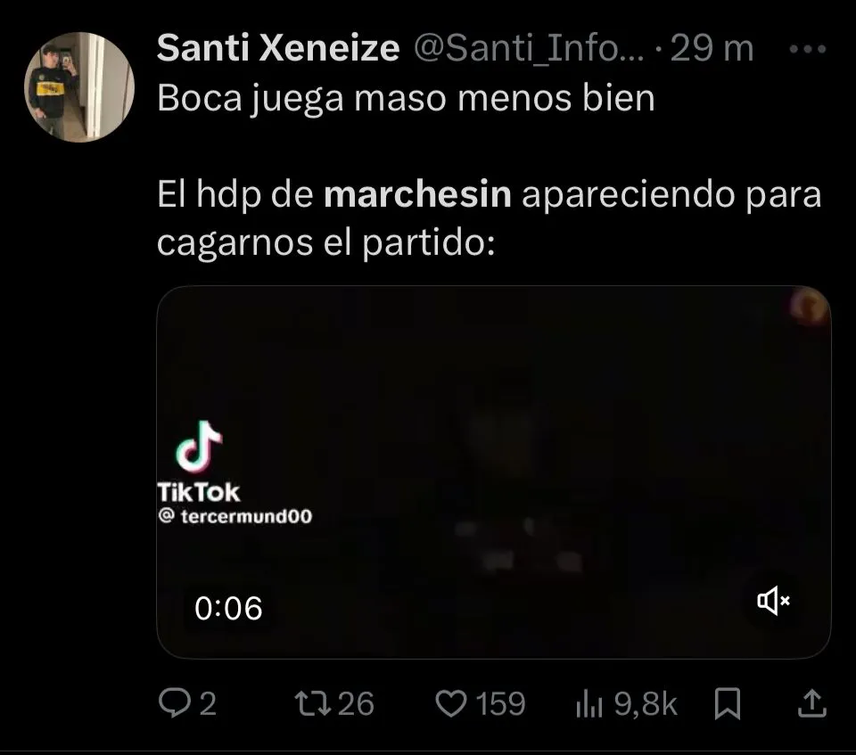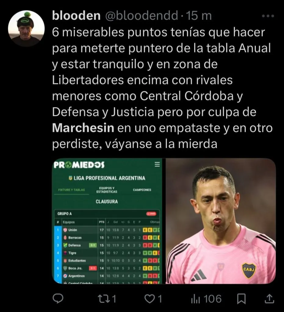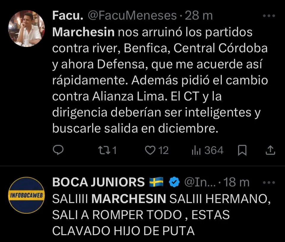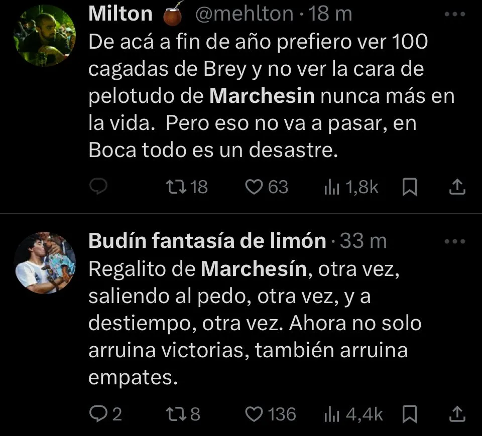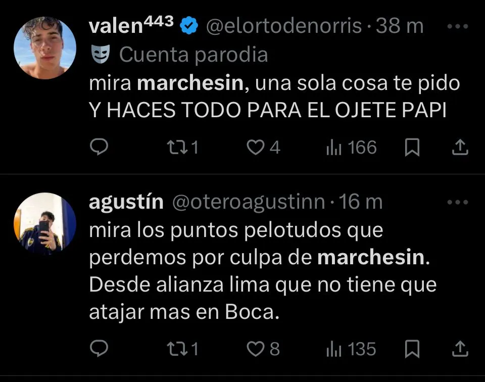 En las redes sociales, la bronca se multiplicó y la figura de Marchesín se convirtió en tendencia entre los simpatizantes xeneizes. Muchos lo responsabilizaron por la derrota, repasaron sus flojas actuaciones recientes y hasta pidieron su salida del equipo. “De acá a fin de año prefiero ver cagadas de Brey y no ver la cara de Marchesín nunca más en mi vida”, escribió un usuario. Otro fue más tajante: “Desde Alianza Lima no tiene que atajar más en Boca”.